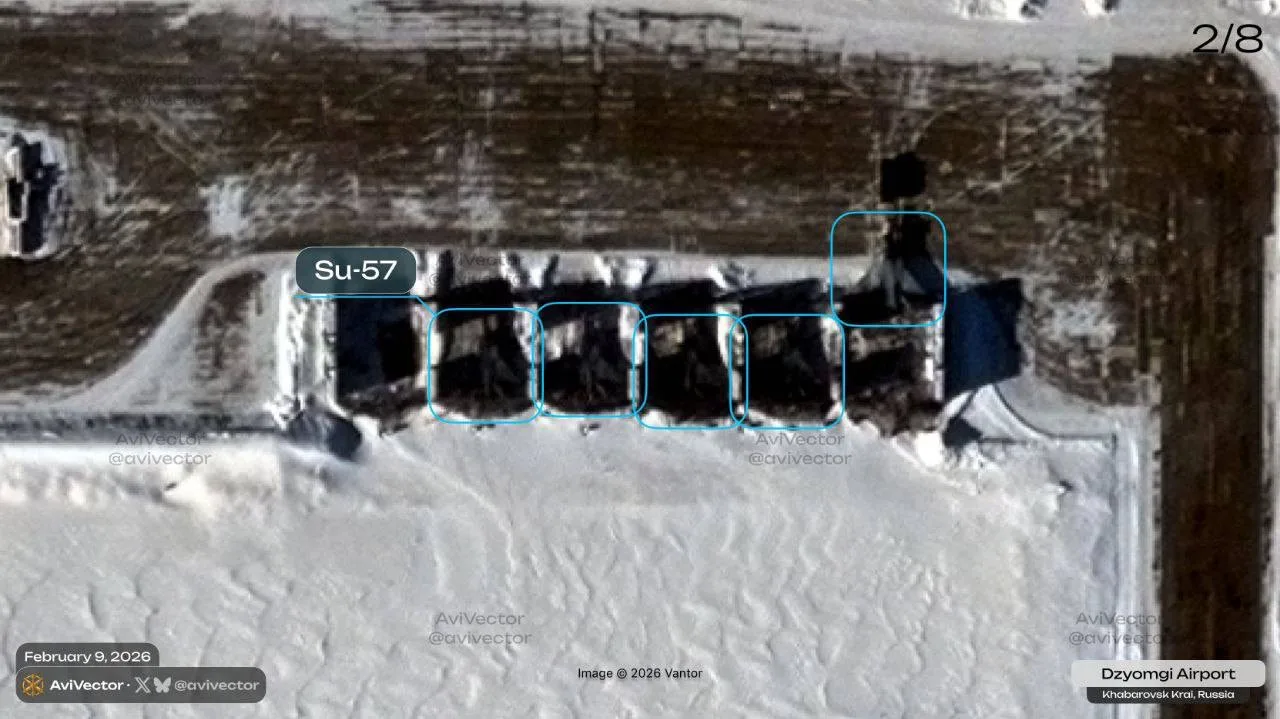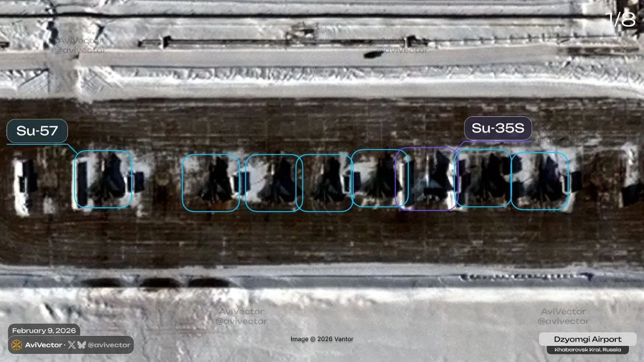 На снимках аэродрома Дзёмги в Комсомольске-на-Амуре, сделанных длиннофокусными спутниками американской компании «Vantor», по состоянию на 9 февраля было замечено внушительное количество Су-57 (15 ед.), а также 18 Су-35С и три МиГ-31БМ.