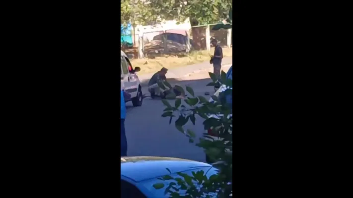 Мужчина лежит на земле и кричит, что его мучают, пока его удерживает сотрудник ТЦК.