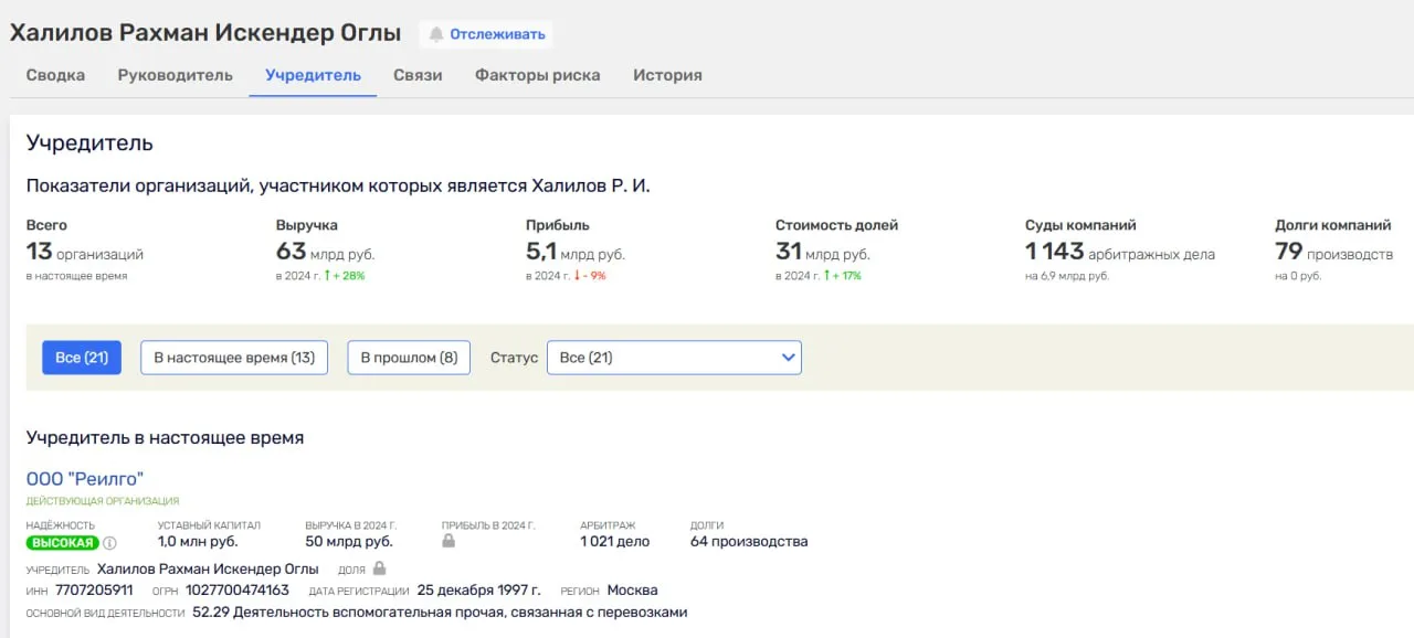 ▪️Владелец Railgo — Рахман Халилов, выходец из Азербайджана. Он учредил 13 компаний с общей выручкой ₽63 млрд в 2024 году. Из них ₽50 млрд пришлось на ключевое юрлицо — ООО «Реилго» (фото 2). Все организации на данный момент действующие.