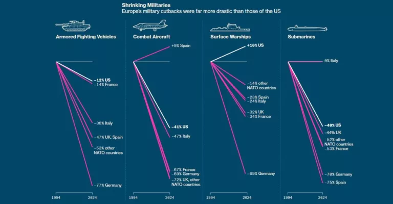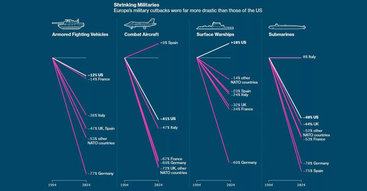 Причина того, что европейских сил не хватит в случае военного противостояния с Москвой, — долгие годы сокращения бюджета и нехватка людей. Например, Франция сократила свою армию на 56% с 1990 года.
