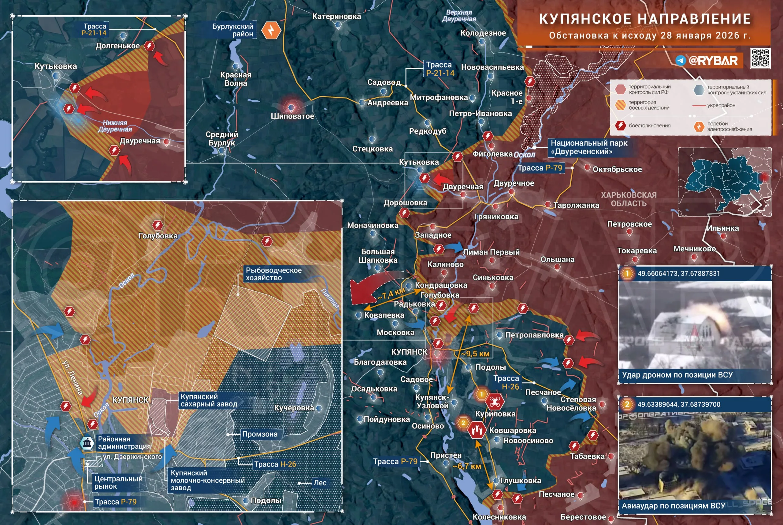 В то же время сам факт выхода к данному населенному пункту говорит о том, что лесные массивы, расположенные между Двуречной и Кутьковкой, действительно находятся под контролем ВС РФ. Однако при некоторых сдвигах к лучшему перелома на Купянском направлении нет. Доклады про якобы «зачистку Купянска-Узлового» и «активных боев за Кошкаровку» оторваны от реальности: к ним ВС РФ даже не вышли, а по обоим поселкам активно работает авиация ВКС.