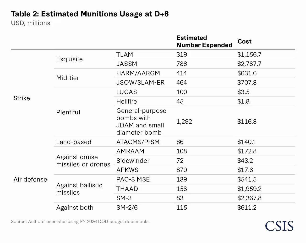 Так вот, CSIS приводит таблицы за первые шесть дней компании, когда ставка шла на массовое применение высокоточных и дорогостоящих средств для подавления ПВО и уничтожения других приоритетных целей. В дальнейшем в ход идут более дешевые средства, как JDAM и hellfire, поэтому их в таблице не так много.