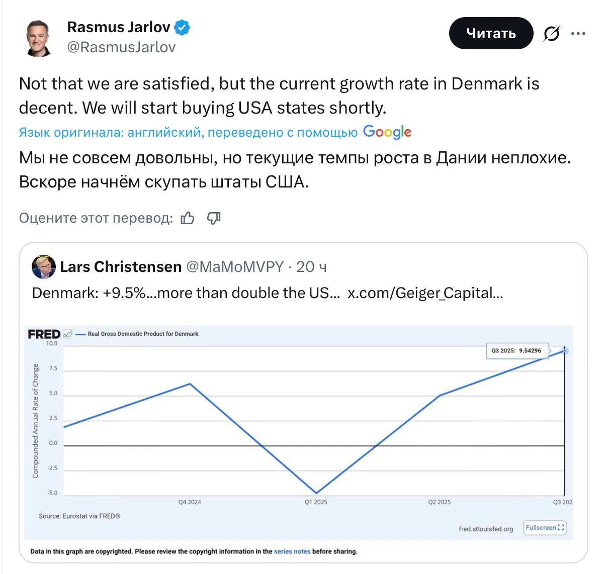 Так он ответил на слова Трампа о Гренландии про присоединение. Политик отметил, что у Дании с экономикой всё неплохо, а вот у США — серьёзные долги.