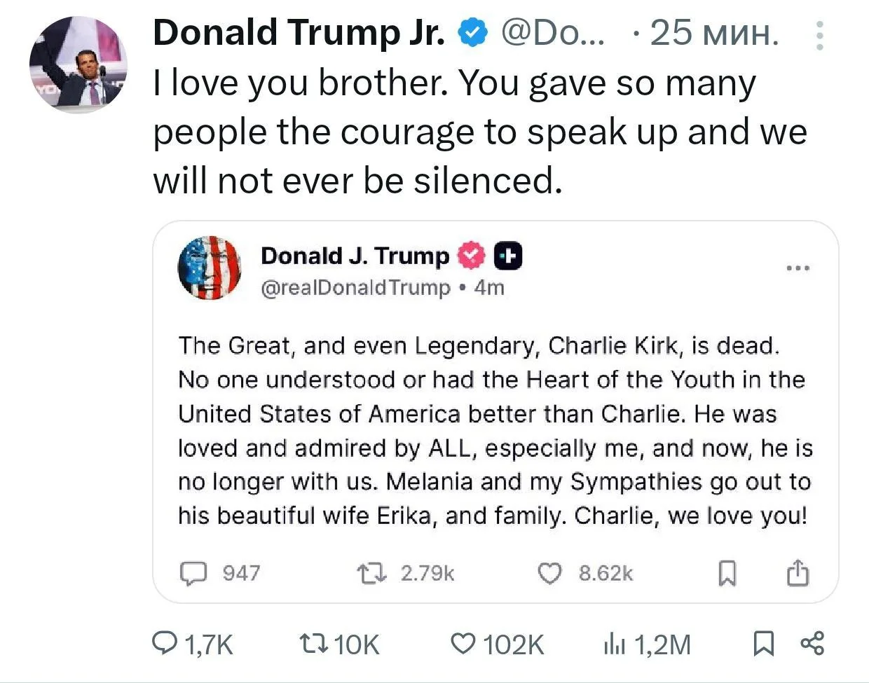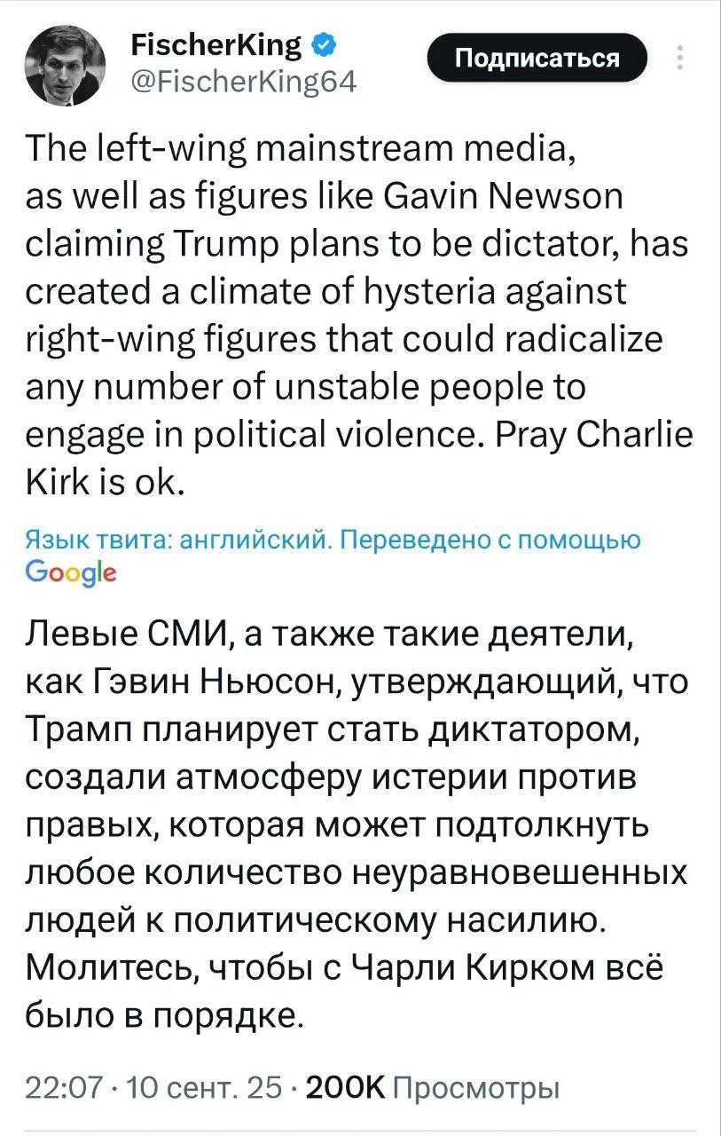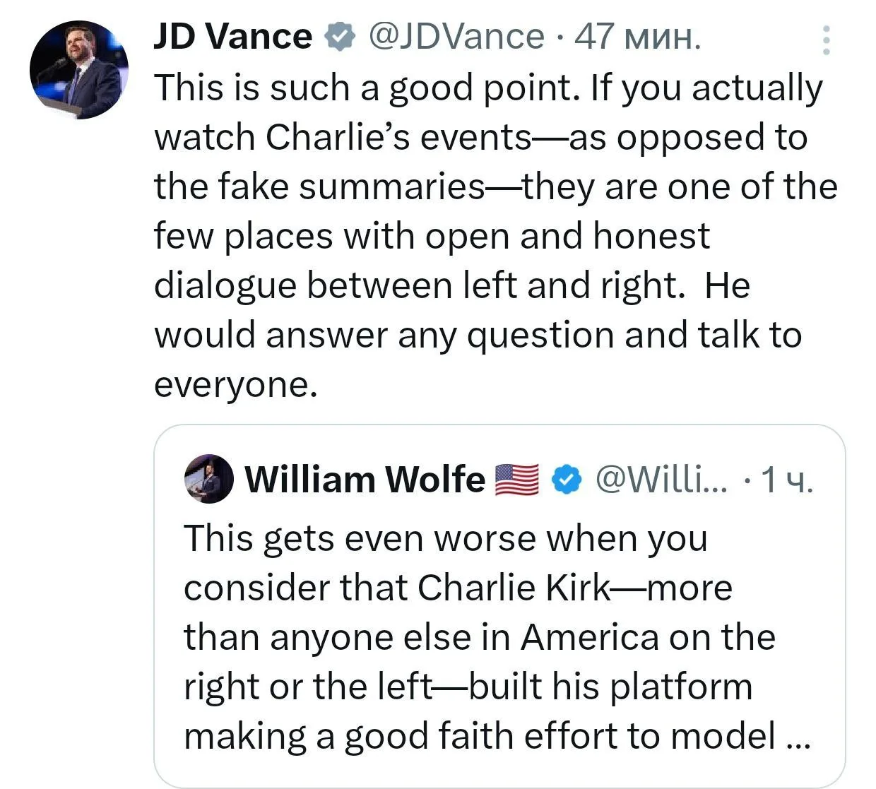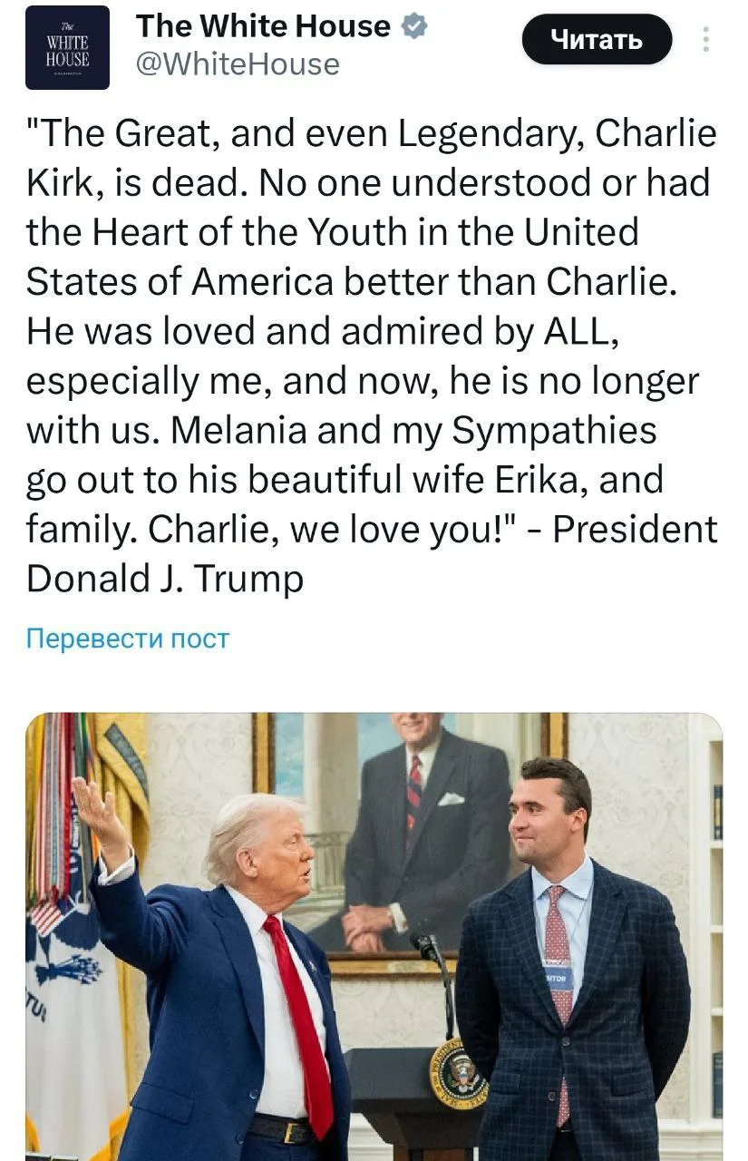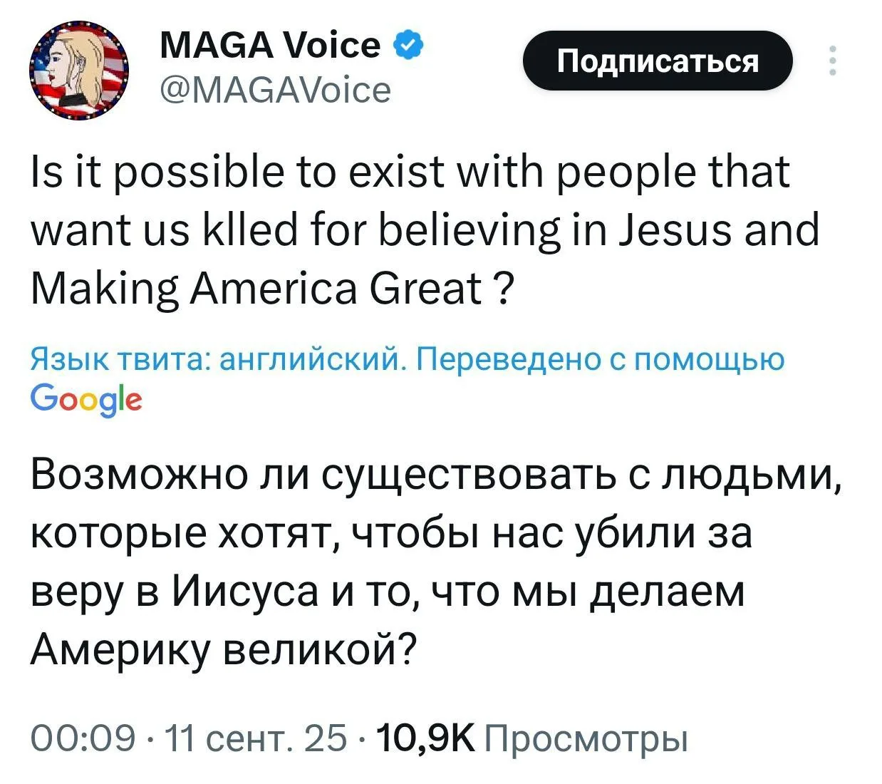 Продемократические общественные движения, ранее боровшиеся с деятельностью Кирка, после слов Трампа сильно притихли и также осудили покушение. Ну а MAGA-движение вчера выкатило очень красноречивый пост, в котором намекнуло сторонникам, что они живут бок о бок с людьми, которые хотят их убить за веру в Иисуса Христа.