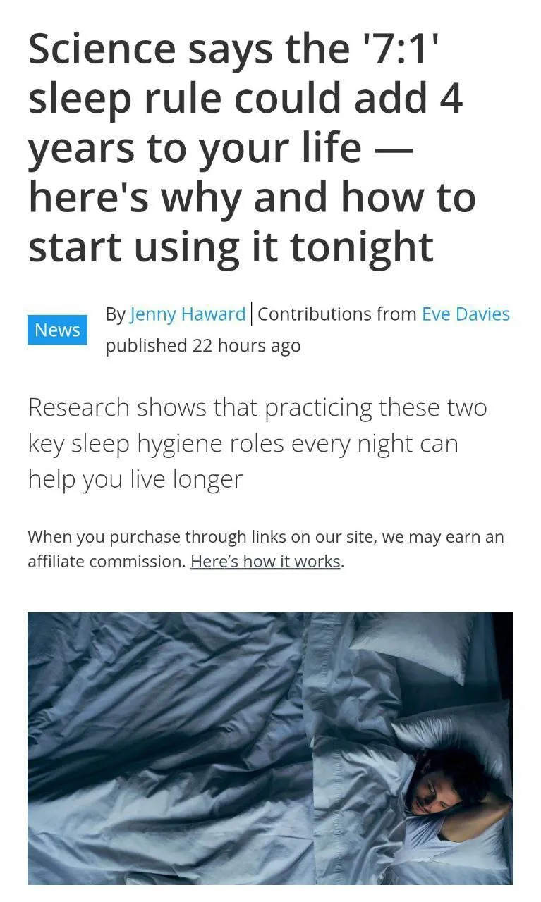 Желающим продлить срок жизни, ученые посоветовали соблюдать правило сна «7:1». Это означает, что спать необходимо по семь часов, ложась в пределах одного часового окна. Если следовать этому хотя бы пять дней в неделю, можно увеличить продолжительность жизни до четырех лет.
