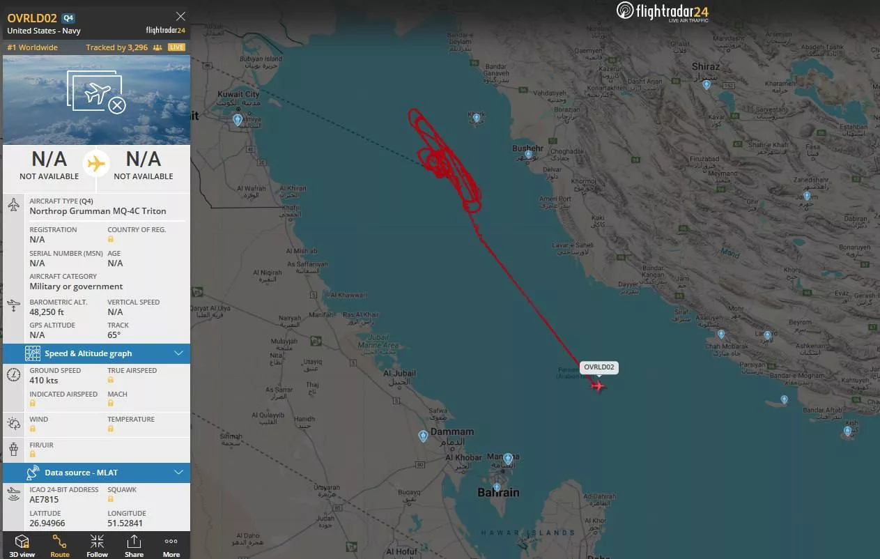 Ранее днём американский разведывательный БПЛА MQ-4C Triton вёл многочасовую разведку у берегов Ирана, в частности длительное время находился у города Бушир.