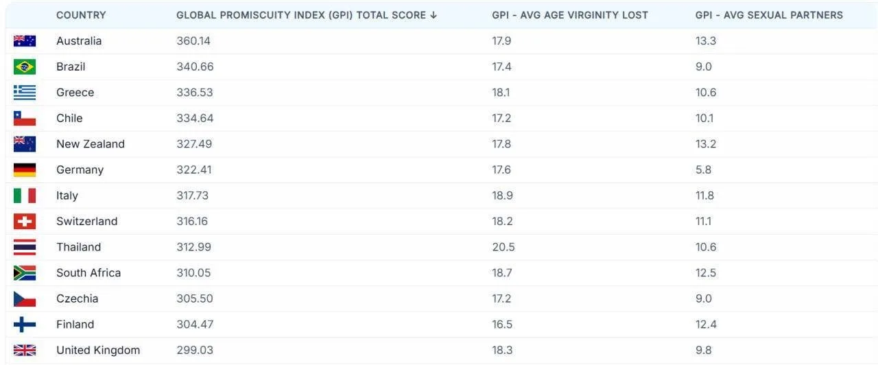 Согласно данным исследования, в России средний возраст потери девственности — 19 лет, среднее число партнёров — 9. Лидеруют в рейтинге Австралия, Бразилия и Греция, а наименее «распущенными» признаны Индонезия, Китай и Индия.