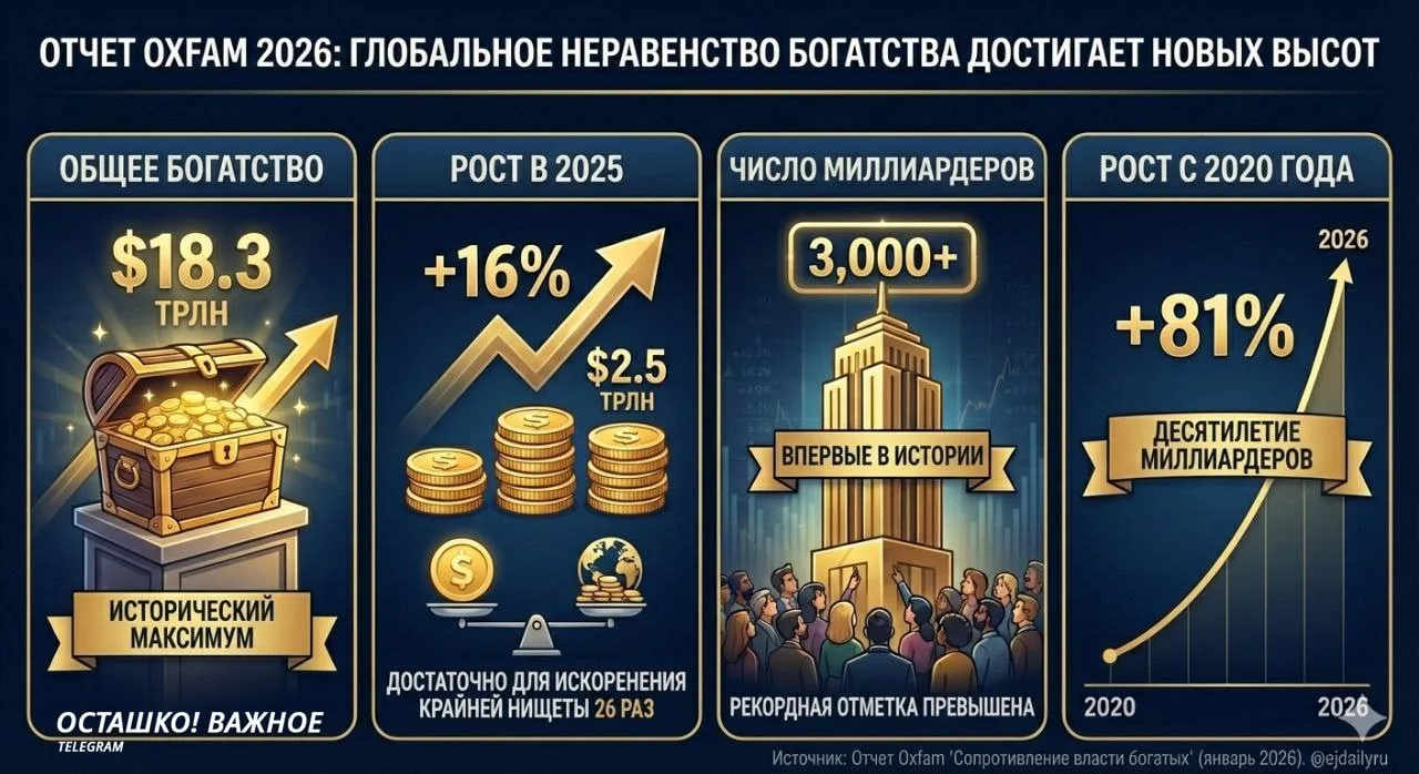 Количество сверхбогатых впервые превысило 3000, при этом почти половина населения Земли живет в бедности. Отчет Oxfam «Сопротивление власти богатых» (Resisting the Rule of the Rich) опубликован 19 января 2026 года.