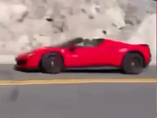 На видеозаписи видно, как красный спортивный автомобиль Ferrari на высокой скорости выезжает из туннеля, после чего его заносит.