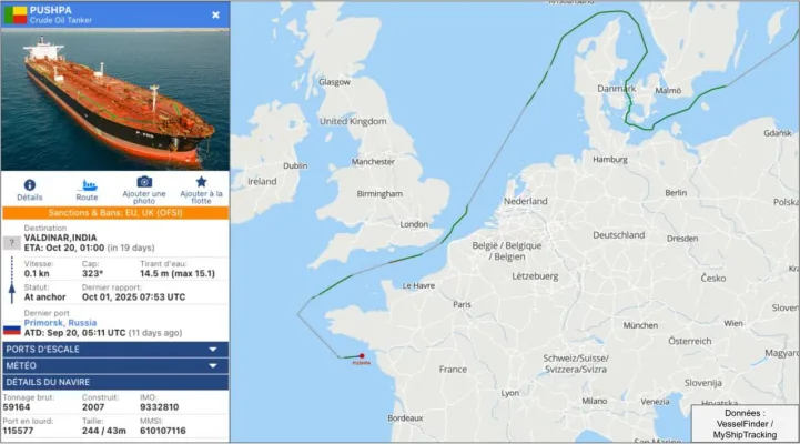 Танкер PUSHPA ходит под флагом Бенина и находится в санкционном списке ЕС за транспортировку российской нефти.