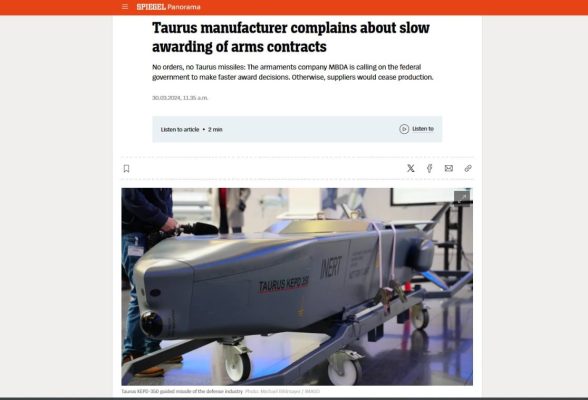 📝 «MBDA приостановила выпуск крылатых ракет Taurus», — передает слова Готтшильда журнал Spiegel.