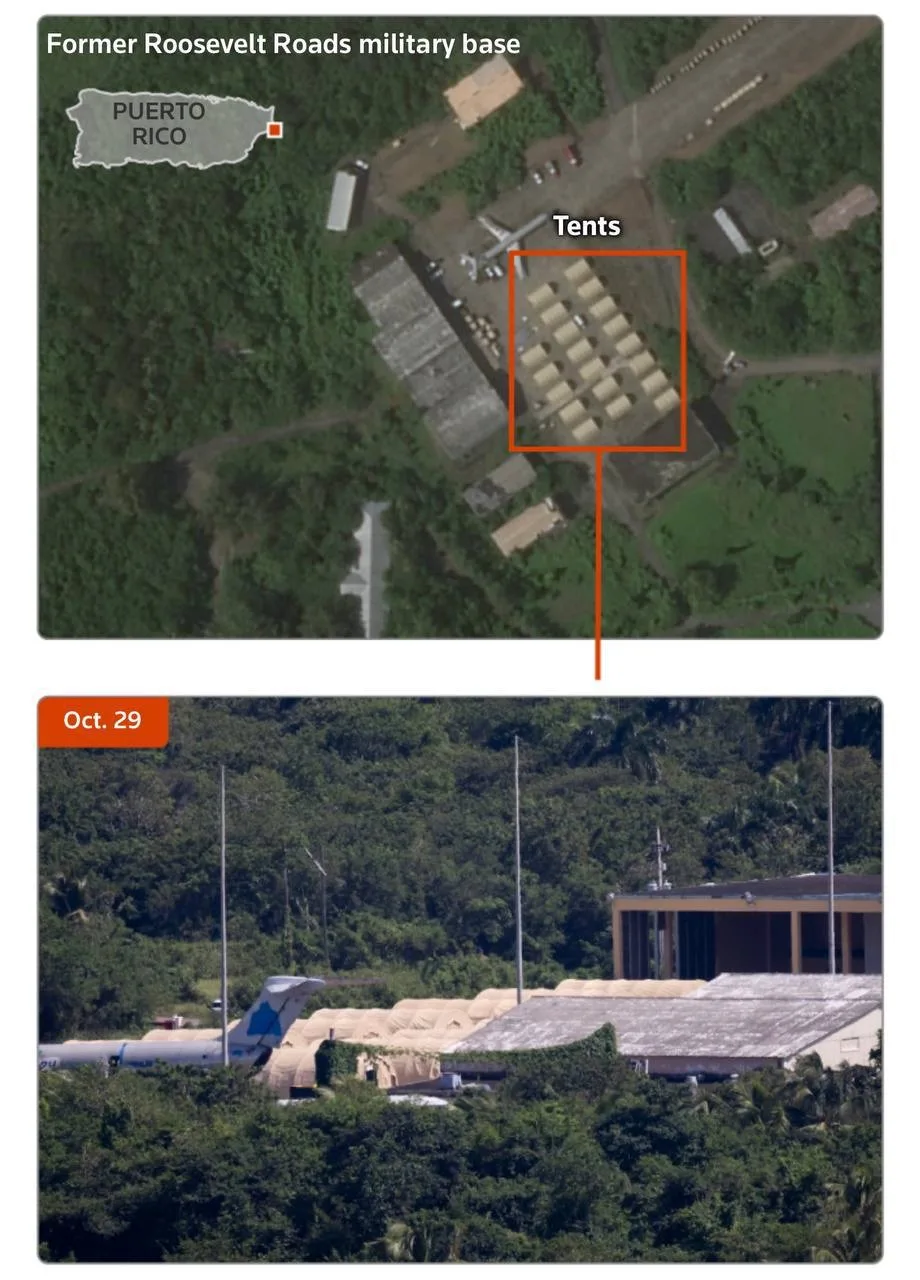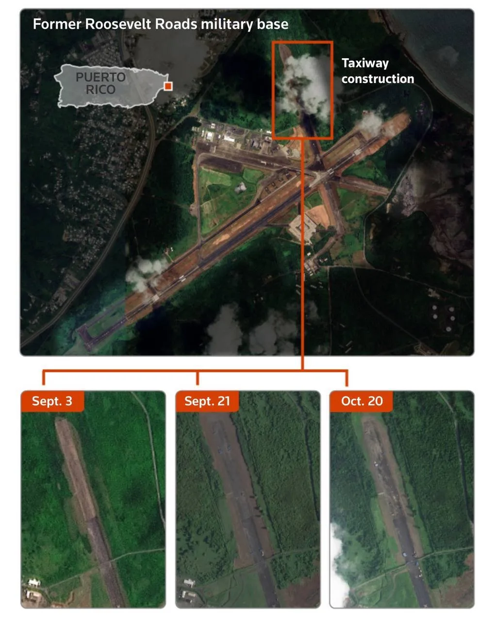 ▪️К 20 октября велись работы по расширению рулёжных дорожек на бывшей военно-морской базе Рузвельт-Роудс, которая является основным опорным пунктом группировки войск на Пуэрто-Рико. Также установлено более десятка палаток для размещения военнослужащих.