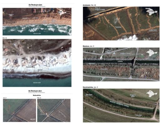 Спутник компании Maxar снял десятки километров укрепленных окопов и блиндажей вдоль береговой линии села Медведевка на севере полуострова.