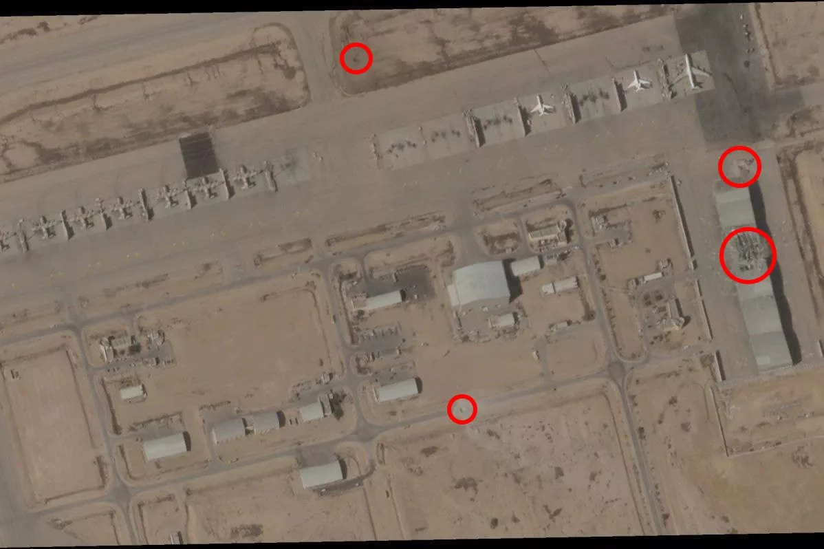 На снимке видно как минимум четыре попадания — одно пришлось на рулежку, одно в землю, одно в ангар и еще одно рядом с ним.