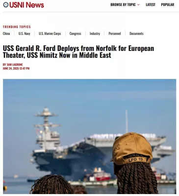 Авианосец USS Gerald R. Ford с 4500 моряками вышел из Норфолка и направлен в Европу. Второй — USS Nimitz — уже в Персидском заливе. Это ответ на ракетный обстрел базы США в Катаре после удара по иранским ядерным объектам, — сообщает USNI News.
