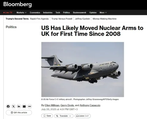 16 июля американский военный самолет с ядерным оружием прилетел на базу Лейкенхит в Великобритании впервые с 2008 года. При этом транспондер был включён и показывал маршрут полёта в открытом эфире, — сообщает Bloomberg.