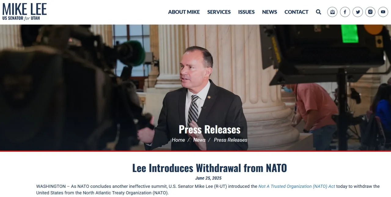 Республиканец Майк Ли внёс в Сенат закон под названием Not A Trusted Organization Act — «Закон о недоверии к организации». Документ обязывает президента денонсировать участие США в НАТО согласно статье 13 Североатлантического договора.