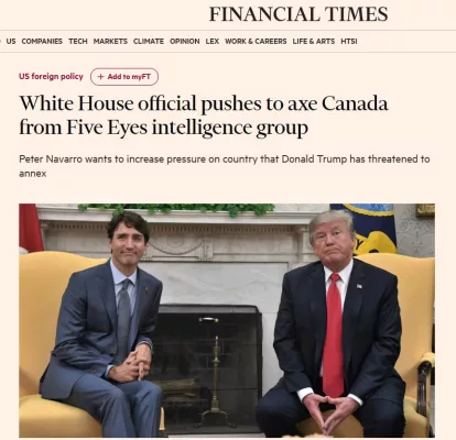 Питер Наварро, советник Трампа, предлагает исключить Канаду из «Пяти глаз» — разведывательной сети США, Великобритании, Австралии и Новой Зеландии. Это происходит на фоне давления Трампа, открыто называющего Канаду «51-м штатом США» и угрожал аннексией.