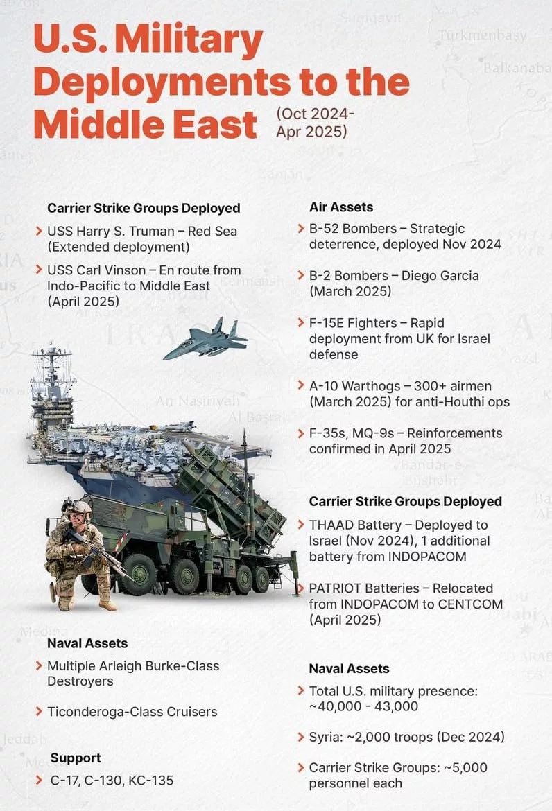 - B-52, B-2, A-10, F-15E, F-35 и MQ-9 уже на театре (https://t.me/c/1428699099/63452) военных действий.