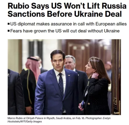 Об этом американский госсекретарь Рубио заявил европейским коллегам в ходе телефонного разговора. Звонок состоялся после его участия в переговорах с российской делегацией в Эр-Рияде, пишет Bloomberg.