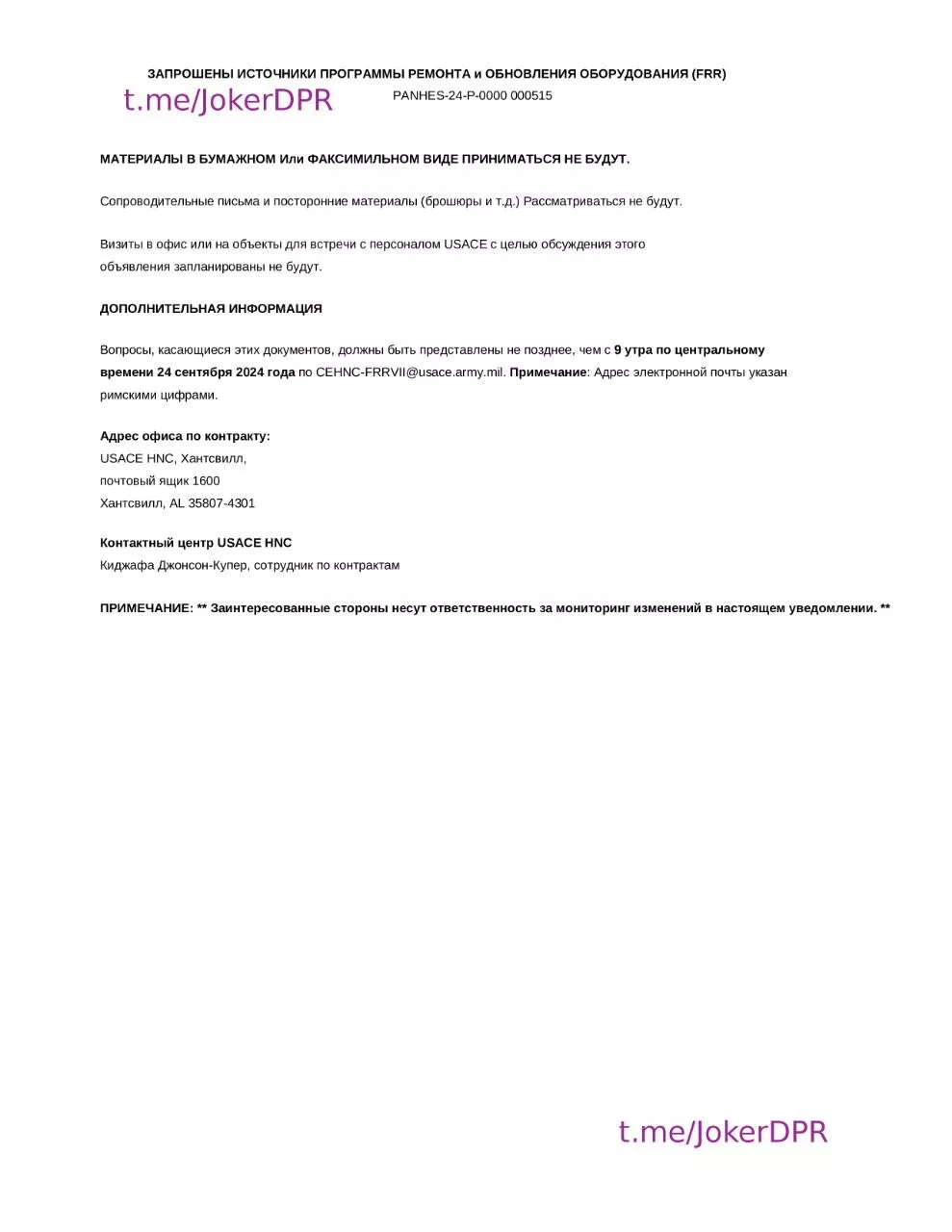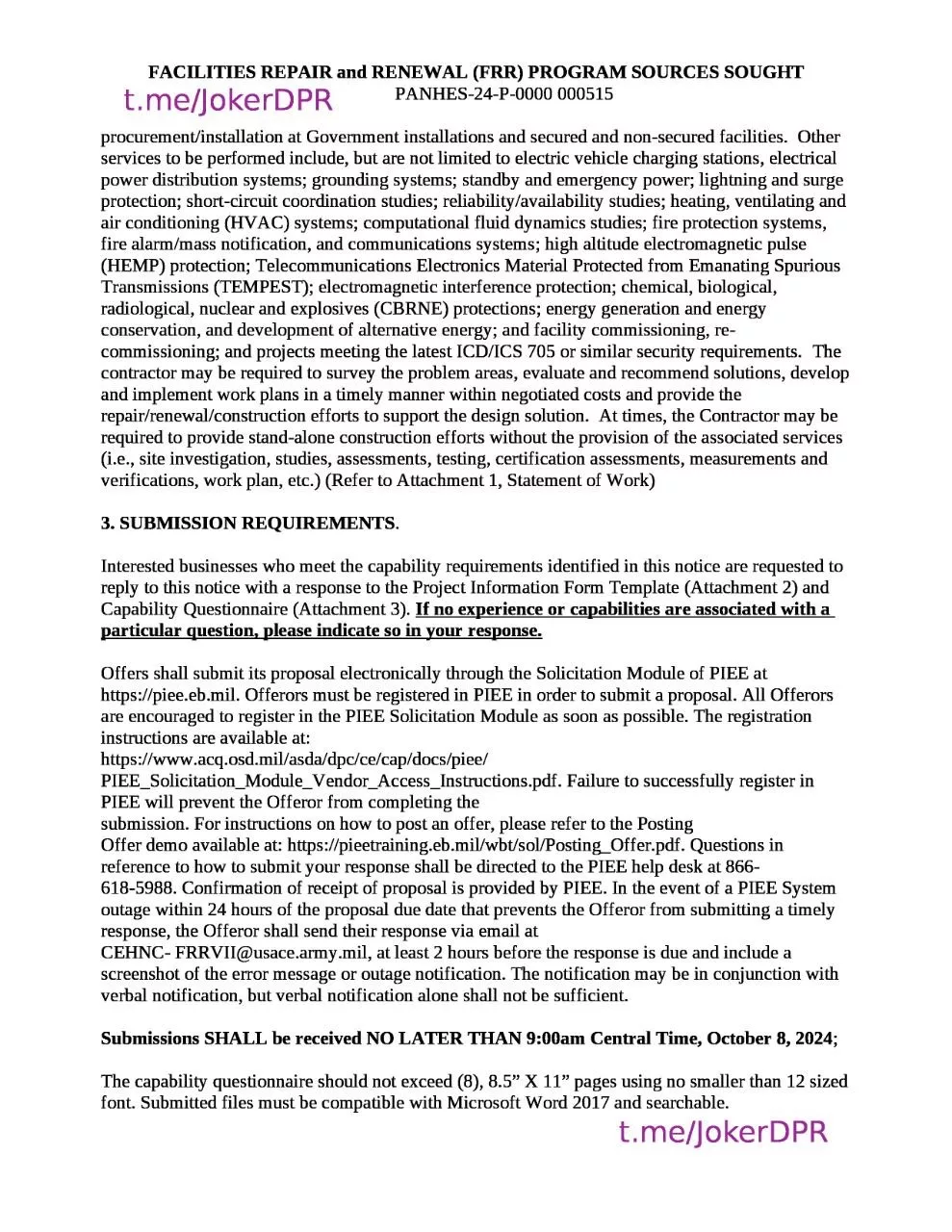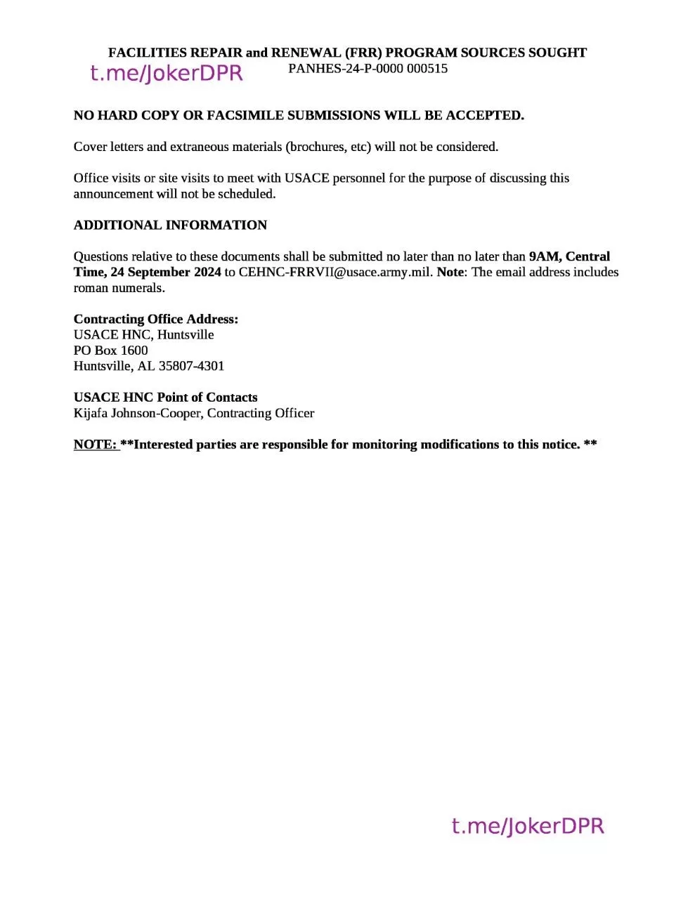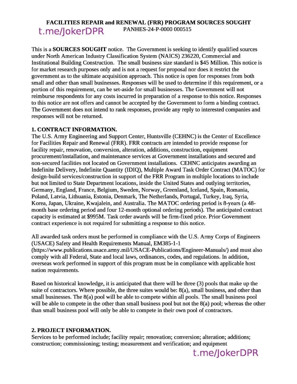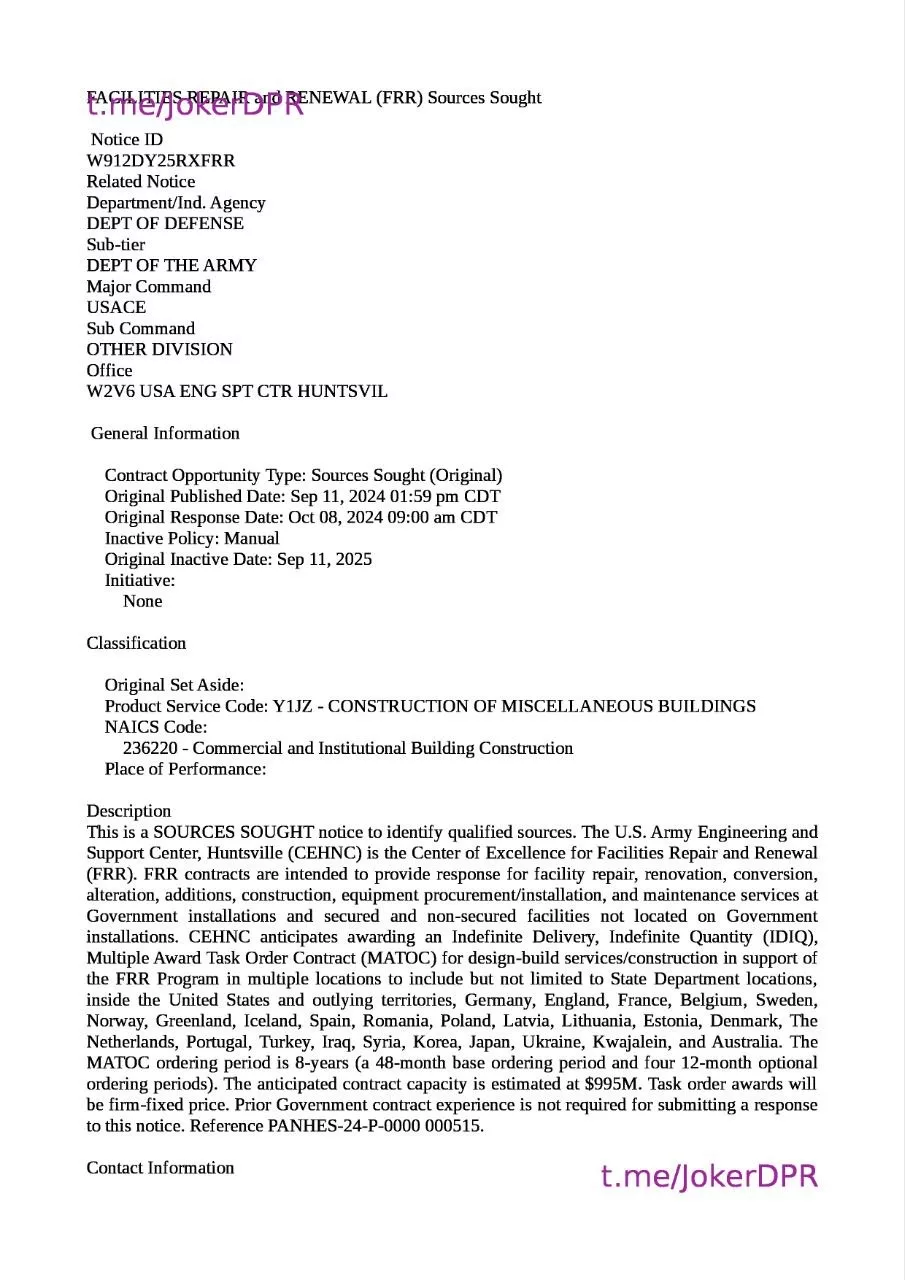 Центр инженерного обеспечения армии США в Хантсвилле (CEHNC) ищет подрядчиков для заключения контрактов на срок 8 лет с возможностью продления еще на год для участия в ремонте и строительстве объектов Госдепа и Министерства обороны США в таких странах, как Германия, Великобритания, Франция, Бельгия, Швеция, Норвегия, Гренландия, Исландия, Испания, Румыния, Польша, Латвия, Литва, Эстония, Дания, Нидерланды, Португалия, Турция, Ирак, Сирия, Южная Корея, Япония, Украина, Кваджалейн и Австралия. Всего планируется потратить 995 миллионов долларов США. Деньги будут выделяться в рамках программы «Передового опыта ремонта и обновления оборудования».