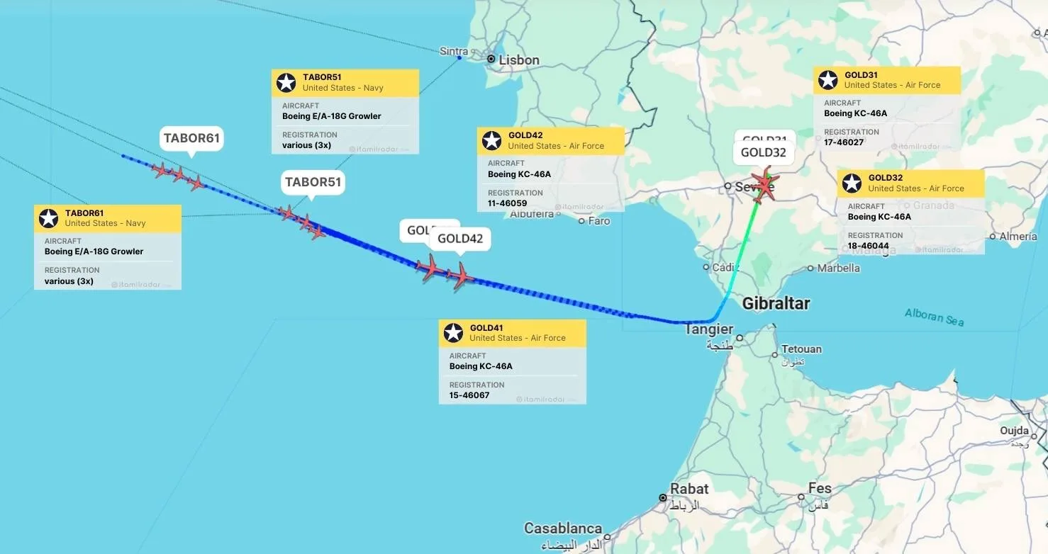 ▪️Шесть самолётов РЭБ EA-18G Growler вылетели с ВМБ Океана в штате Вирджиния на ВМБ Рота в Испании при поддержке четырёх KC-46A Pegasus.