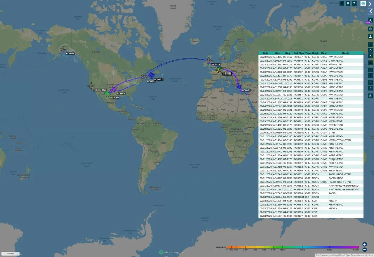 За неполные пару недель были зафиксированы следующие характерные рейсы C-17 Globemaster III и C-5M Super Galaxy: