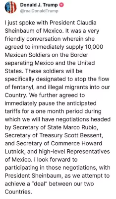 🇲🇽 Аналогичную отсрочку получила Мексика. По словам Трампа, президент Шейнбаум согласилась немедленно направить 10 тыс. солдат на границу для остановки потока фентанила и нелегальных мигрантов.