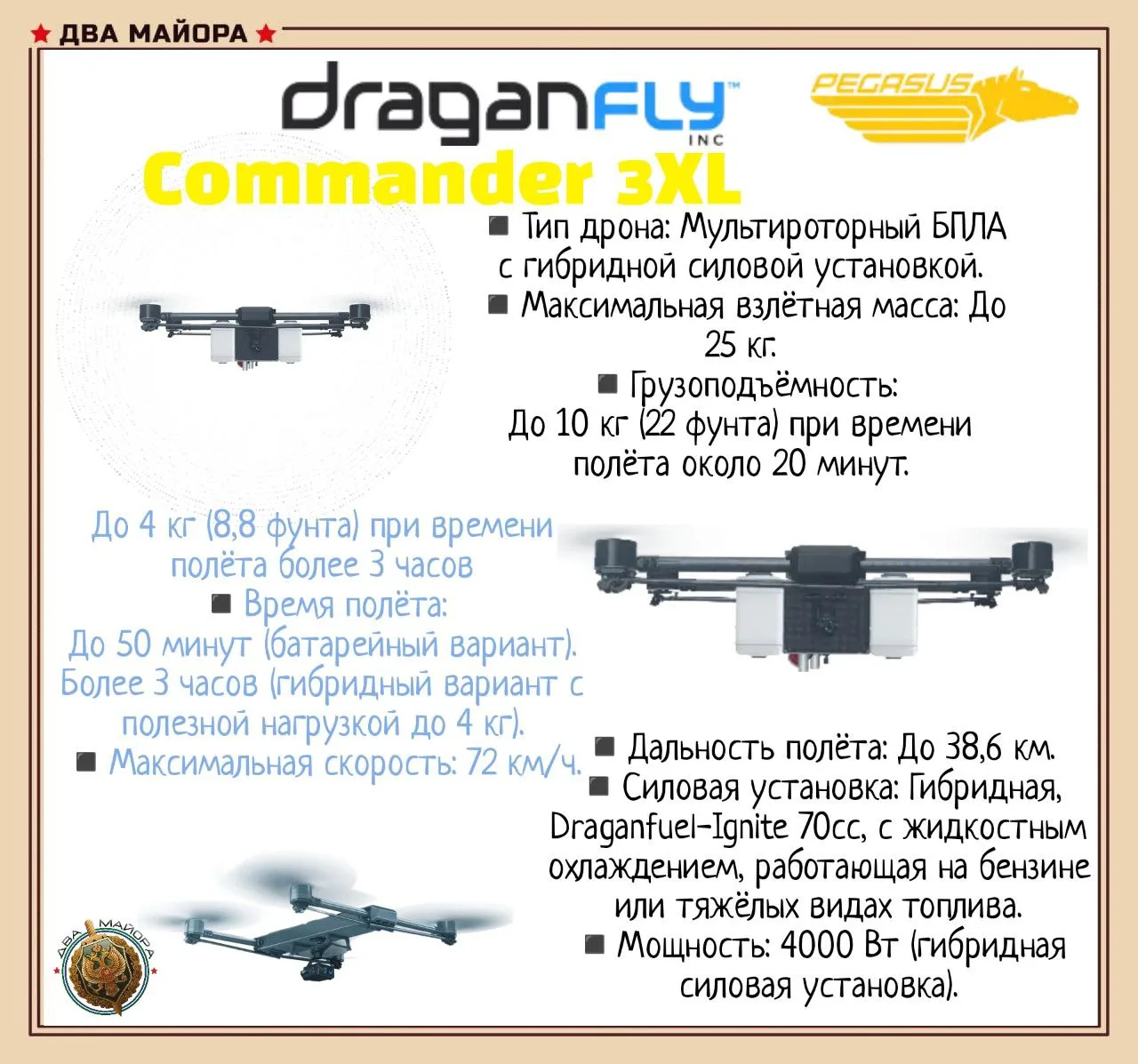 Американская компания Draganfly объявила о подписании контракта с Минобороны США на поставку коптеров Commander 3XL – многороторных дронов массой 13,2 кг, способных нести до 10 кг полезной нагрузки в течение 55 минут и на дальность до 38 км.