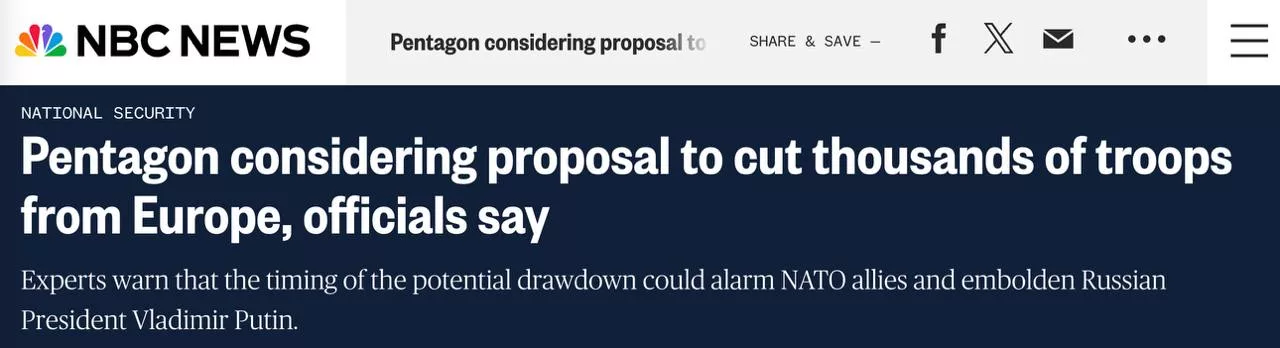 🇪🇺 По данным NBC, европейские дипломаты встревожены: если Вашингтон действительно начнет сокращать силы, это усилит опасения, что Штаты готовы «отойти в сторону» и оставить союзников один на один с растущими угрозами.