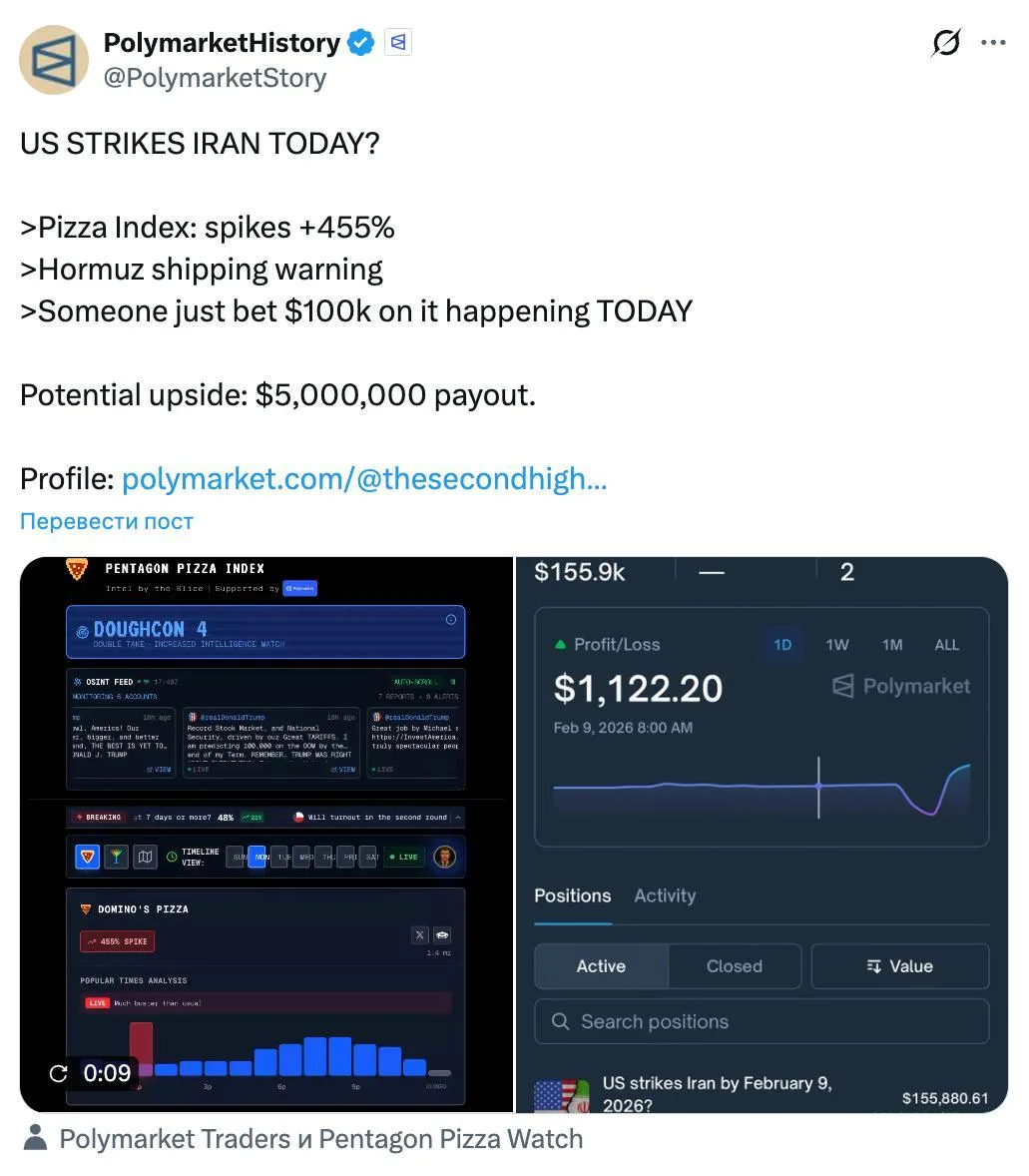 Градус ожиданий подтверждается и на финансовых рынках. Неизвестный трейдер сделал ставку в $100 000 на то, что эскалация случится именно сегодня. В случае успеха ставка принесет ему $5 млн.