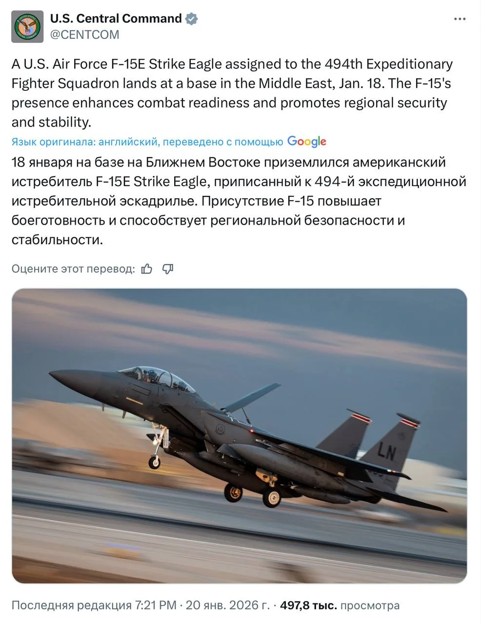 Авиационные онлайн-трекеры сообщают, что эскадрилья из 12-и истребителей F-15E Strike Eagle, в сопровождении самолётов-заправщиков KC-135 Stratotanker вылетели с авиабазы Лейкенхит в Британии на американские базы в Иордании. Эти самолёты участвовали в защите Израиля от атак иранских беспилотников и крылатых ракет в ходе «12-дневной войны» в июне прошлого года. Американское командование в регионе долгое время не комментировало текущее положение войск, но вчера опубликовало снимок приземляющегося F-15.