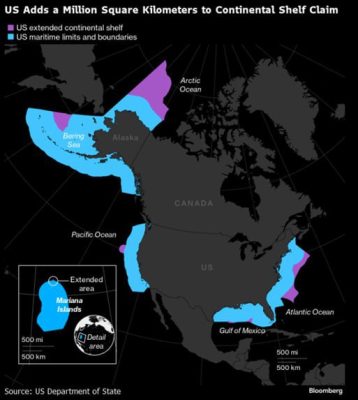 Расширенный континентальный шельф занимает около 1 млн км2 и преимущественно располагается в Арктике и Беринговом море, пишет Bloomberg. Этот район приобретает «все большее стратегическое значение», на него также претендуют Россия и Канада.