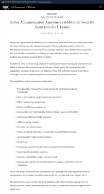 Содержание пакета в рамках USAI на 1,5 миллиарда долларов в подробностях не раскрывается. Сказано лишь, что средста пойдут на усиление украинской системы ПВО, поставку огневых и противотанковых средств, а также на обслуживание переданного ранее вооружения.