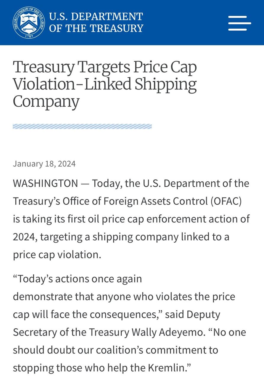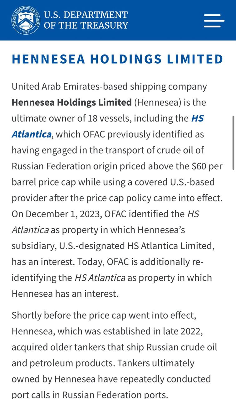 «Министерство финансов США ввело санкции против судоходной компании ОАЭ Hennesea Holdings Limited и ее 18 танкеров, перевозящих нефть из России», – говорится в заявлении.