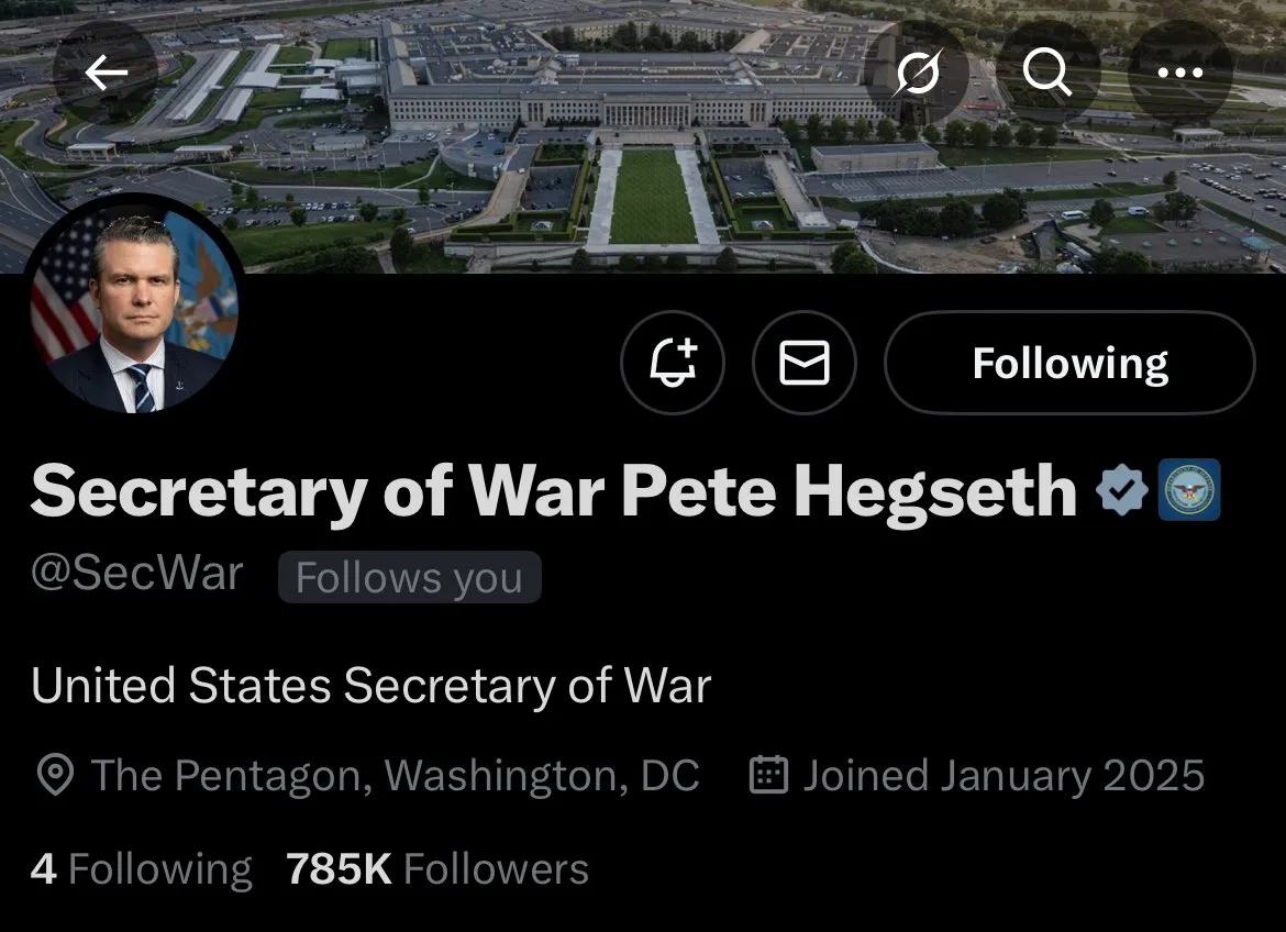 - Тем временем министр обороны США Пит Хегсет сменил подпись в 𝕏 на «министр войны».