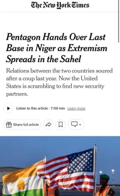 Весной американские военные покинули базу в столице страны Ниамее, а сейчас — базу в Агадесе, которую использовали для миссий с участием разведывательных беспилотников. Небольшое число военнослужащих осталось лишь в американском посольстве. Там они пробудут короткое время, чтобы завершить административные дела, пишет The New York Times.
