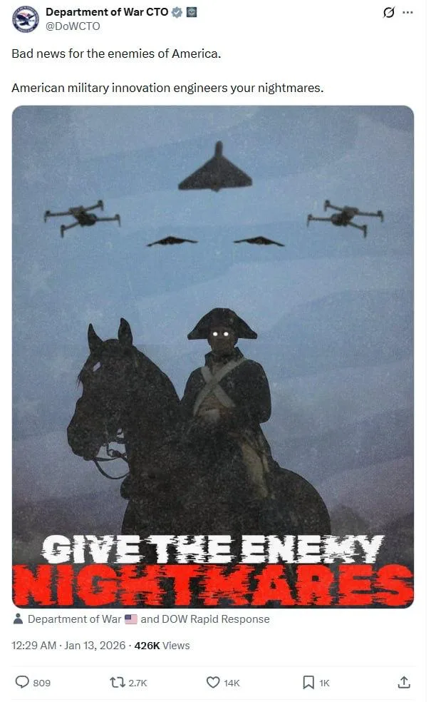 Министерство войны выложило в X плакат с подписью «Вызовите у врага кошмары». Только на первом плане американской техники – почему-то российский дрон «Герань».