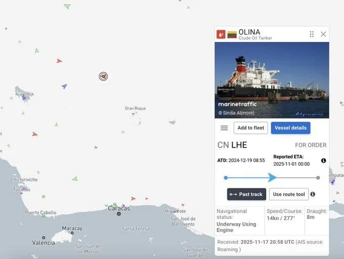 Olina ранее вышло из Венесуэлы, после чего вернулось в регион, где и было перехвачено. В общедоступной базе Equasis указано, что танкер шел под флагом Тимора-Лешти, однако американская сторона утверждает, что флаг использовался фиктивно.