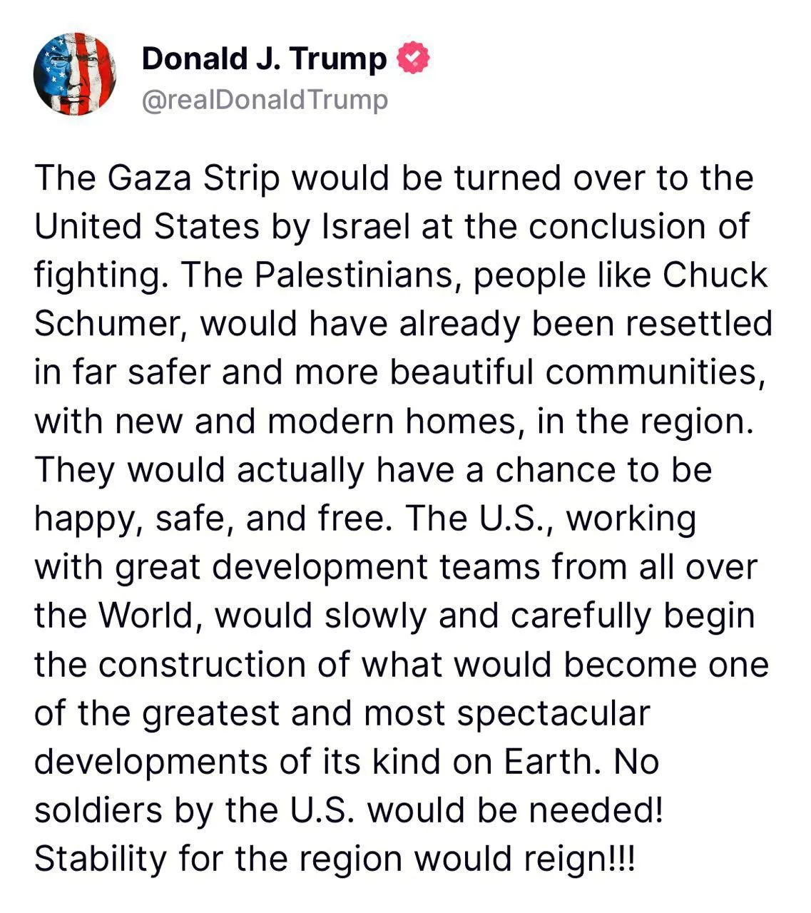 По завершении боевых действий Израиль передаст сектор Газа США. Палестинцы, люди как Чак Шумер, уже были бы переселены в гораздо более безопасные и красивые поселения в этом регионе с новыми и современными домами. У них действительно будет шанс быть счастливыми, жить в безопасности и быть свободными.