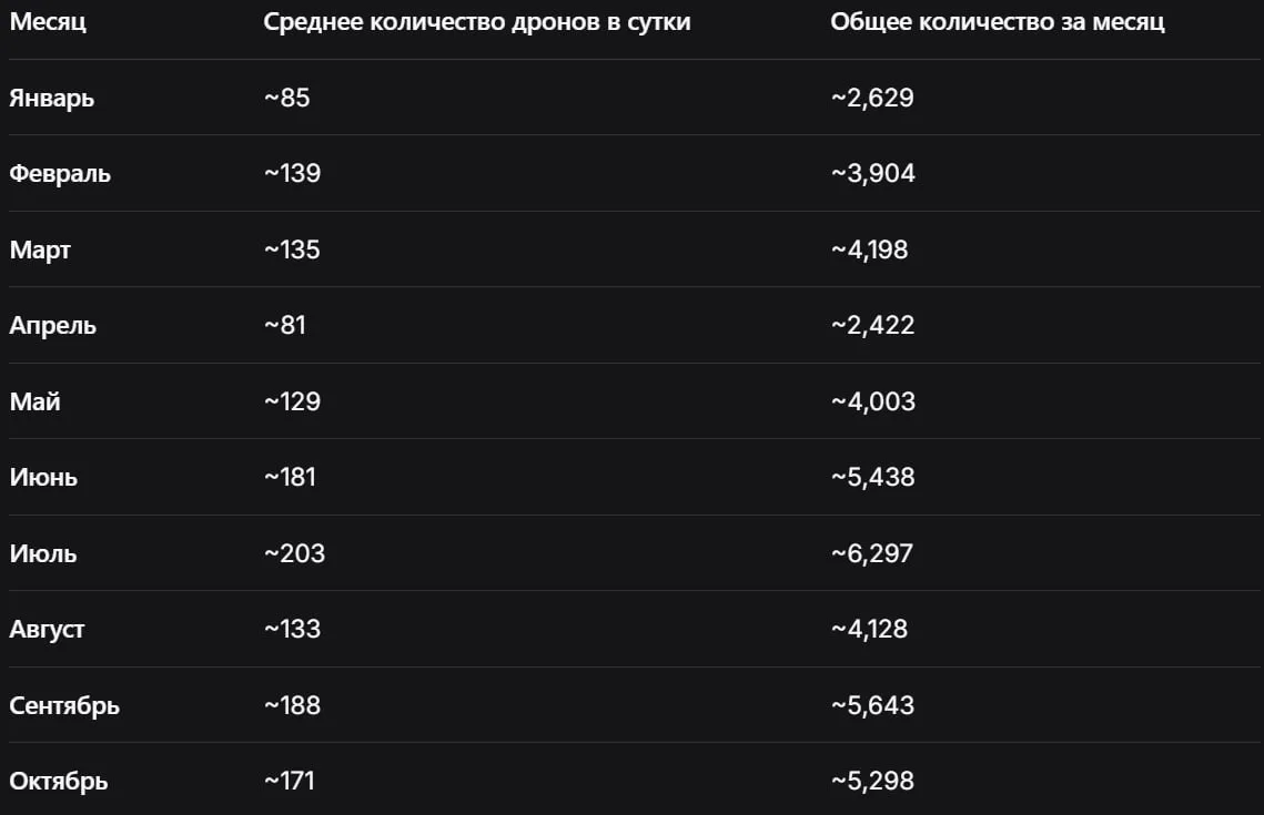 Данные из открытых источников показывают последовательную динамику. Если в январе среднесуточный показатель составлял около 85 дронов, то к июлю он вырос до 203 единиц — максимального значения за год. Однако с августа наблюдается стабилизация в диапазоне 130-190 дронов в сутки. Эта цифра существенно ниже прогнозировавшихся ранее 1000 дронов в сутки, но при этом Россия сохраняет значительный резерв для эскалации, что подтверждается единичными массированными атаками, как, например, запуск 810 дронов за одну ночь в начале сентября.