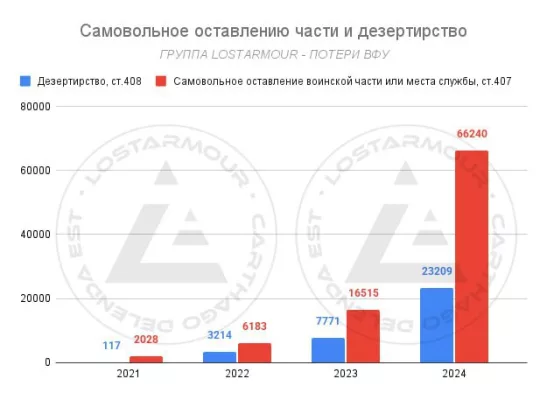 Учитывая, что в одном уголовном деле может фигурировать несколько человек, общие потери мобилизационного ресурса Киева за 2024 год оценивается минимум в 100 тысяч только сбежавшими за границу, оставившими часть или дезертировавшими.
