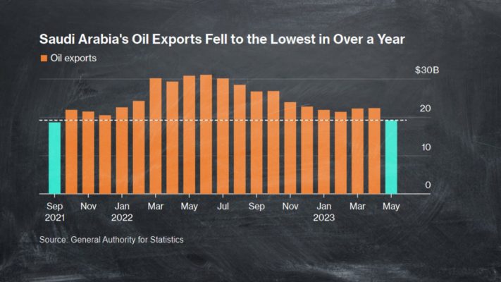 Поступления Саудовской Аравии от экспорта нефти сократились более чем на треть до самого низкого уровня с сентября 2021 года. Экспорт нефти королевства в мае упал до чуть более 19 миллиардов долларов. Доля продаж нефти в общем объеме экспорта упала до 74% с почти 81% год назад.