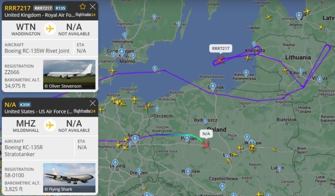 В небе вокруг Калининграда нарезает круги британский самолёт-разведчик Boeing RC-135W Rivet Joint. Параллельно в ожидании, судя по всему, дополнительных разведывательных самолётов, над Польшей кружат топливозаправщики Boeing KC-135R Stratotanker ВВС США.