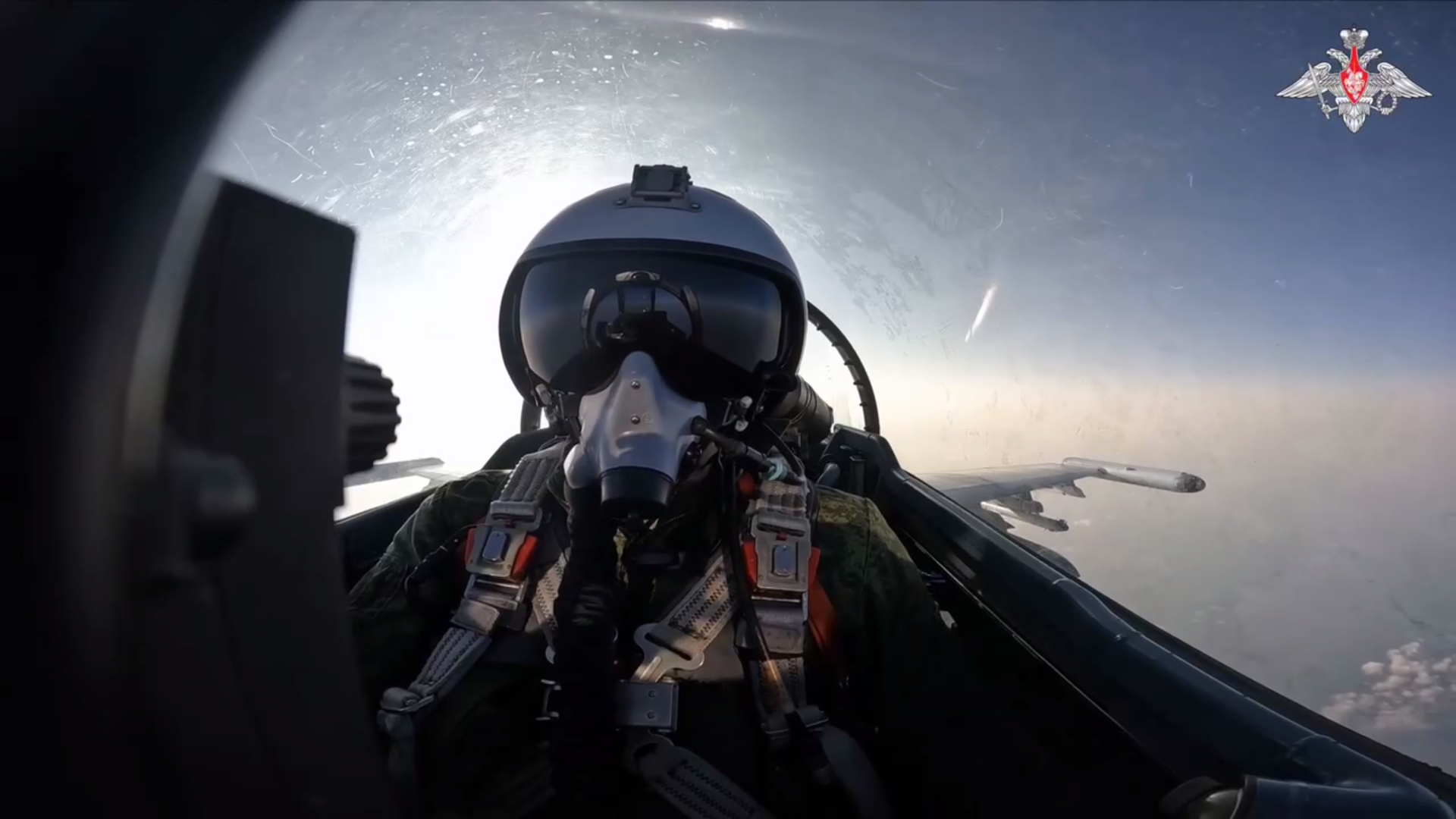 Су-35С ВКС с подвешенной ракетой «воздух-поверхность» X-31П, а так же с ракетами малой дальности «воздух- воздух» Р-73, во время воздушного патрулирования над зоной СВО.