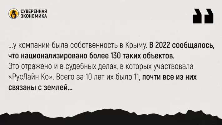 Известно, что у компании была собственность в Крыму. В 2022 сообщалось, что национализировано более 130 таких объектов. Это отражено и в судебных делах, в которых участвовала «РусЛайн Ко». Всего за 10 лет их было 11, почти все из них связаны с землей — правом на собственность, использованием и исполнением обязательств по договору аренды. В одном из судебных дел истцом выступало МО РФ. Спор был о правах владения и самостроях. Это дело еще рассматривается в первой инстанции.