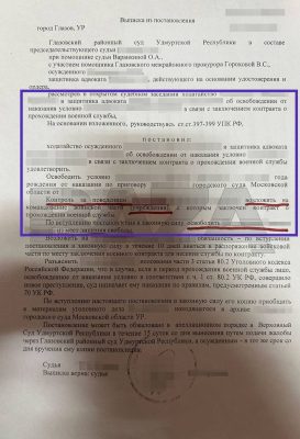 Освобождение от наказания судом стало возможным после принятия законопроекта, уточняющего порядок освобождения от уголовной ответственности тех, кто заключил контракт о прохождении военной службы. Заключённому, подписавшему контракт с ВС РФ, заменяют реальный срок условным, а полное освобождение от наказания происходит со дня получения госнаграды или увольнения с военной службы по возрасту, по истечении контракта или с окончанием мобилизации.