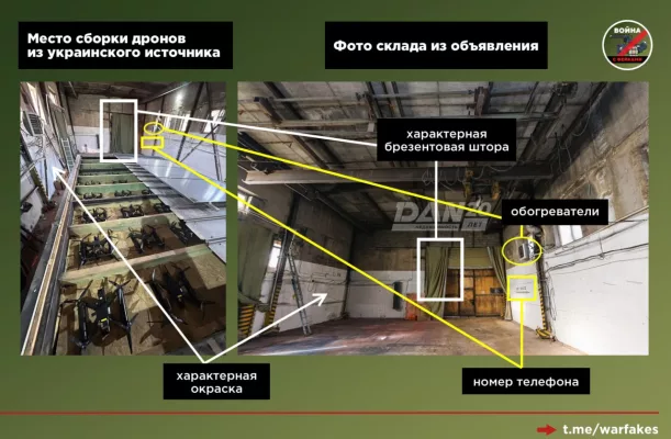 «Помещение с идентичным краном и такими же окнами ранее сдавалось в аренду за 350 тысяч рублей в месяц — нам удалось обнаружить объявление о сдаче в архивах специализированных сайтов. Адрес помещения: Челябинск, Свердловский тракт 28А. Несмотря на попытки замазать детали фото блюром, основные детали остались узнаваемы: форма окон, занавес дверей, кран-балка, несущие конструкции помещения. На одной из стен есть надпись (вероятно, это номер телефона), который видно и на фото из украинских источников» — пишет Война с фейками.