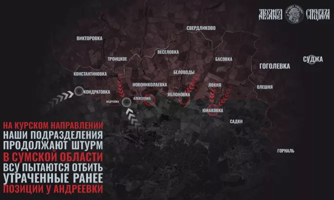 - На направлении Сумской области, где продолжается наше наступление, противник пытается контратаковать. Силами 225 ОШП ВСУ предприняли безуспешную попытку наступления на позиции ВС РФ в лесополосе в районе 1 км южнее Алексеевки.