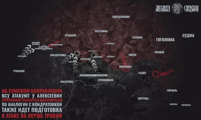 - ВСУ реализуют схожий замысел, как и в Кондратовке, наступая с флангов и пытаясь отрезать село от снабжения. 71 ЕБр и 425 ОШП атакуют на участке Варачино, а 225 ОШП вклинивается со стороны Кондратовки и Андреевки.